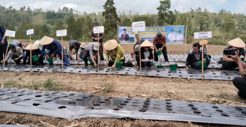 SAMOSIR.WAHANANEWS.CO - Maduma, Guna dukung Program Presiden RI Prabowo Subianto, dalam Ketahanan Pangan, Bupati Samosir Vandiko Gultom, bersama Kapoksi Konservasi Air Direktur Jendral Lahan Dan Irigasi Pertanian Kementerian Pertanian RI Risda br Sinaga, Didampingi Kepala Dinas Ketapang dan Pertanian Tumiur Gultom dan Dua Kelompok Tani yang ada di desa Maduma Kecamatan Simanindo melaksanakan penanaman perdana pengembangan bawang putih seluas 20 hektar di Desa Maduma Kecamatan Simanindo, Kamis (30/4/2026).