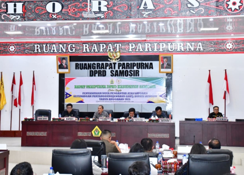Adapun penyampaian LKPJ tersebut merupakan kewajiban kepala daerah sebagai bentuk akuntabilitas penyelenggaraan pemerintahan selama satu tahun anggaran. Rapat Paripurna dipimpin Ketua DPRD Samosir Nasip Simbolon didampingi Wakil Ketua DPRD Sarhockel Tamba dan Osvaldo Simbolon. Jum'at (10/04/2026)