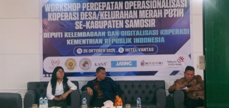 SAMOSIR.WAHANANEWS.CO -Siallanguan, Pemerintah Kabupaten Samosir bersama Kementerian Koperasi dan UKM RI menggelar Workshop Percepatan Operasionalisasi Koperasi Desa Merah Putih (KDMP) se-Kabupaten Samosir, Kegiatan di buka resmi Wakil Bupati Samosir Ariston Sidauruk di aula pertemuan Hotel Vantas desa Sialanguan kecamatan Pangururan, Sabtu,( 25/10./2025)